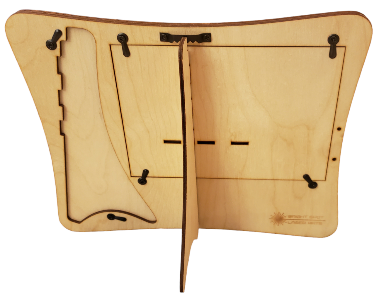 Frame has a glossy birch finish with glass colored acrylic for photo. Overall size is 9x11 inches.