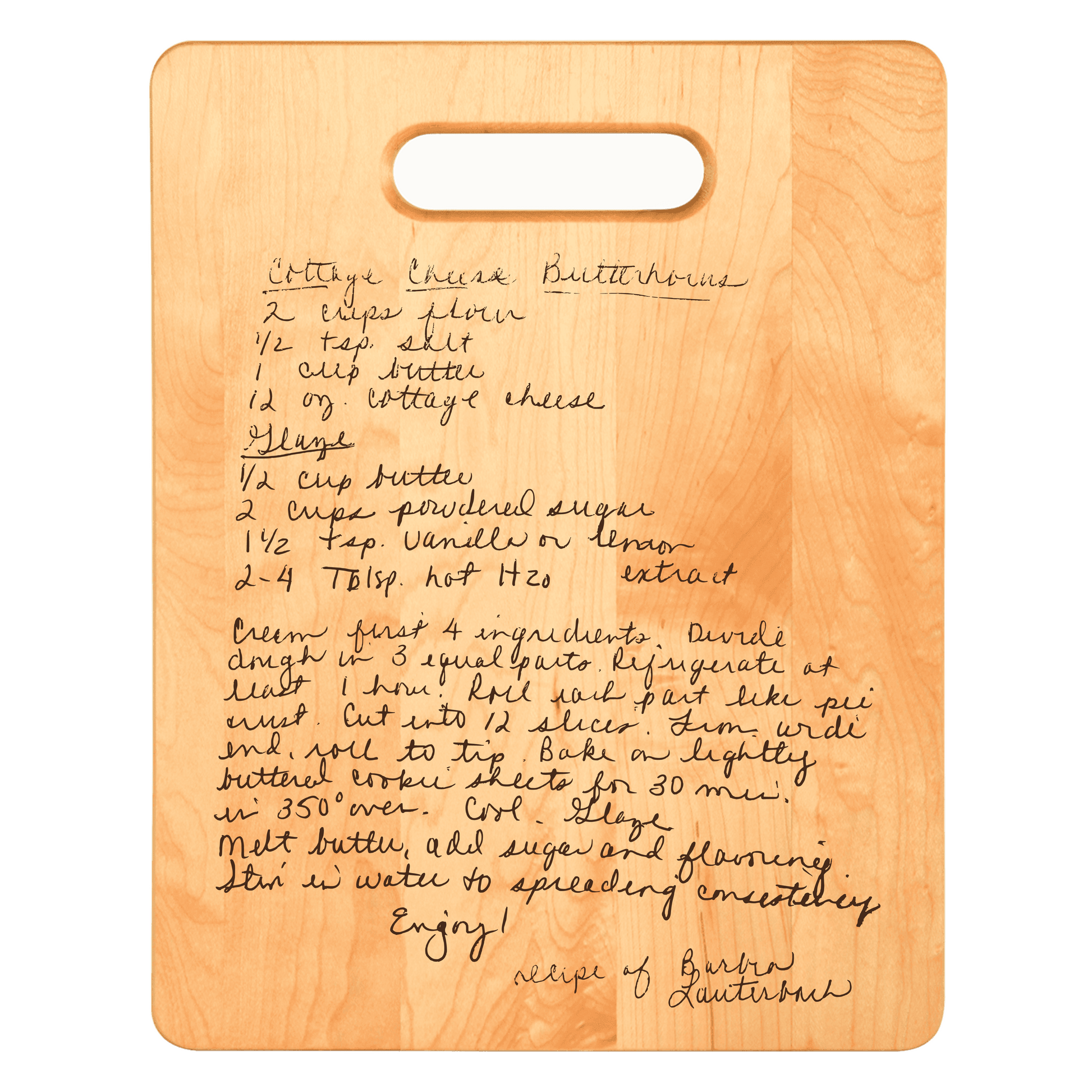 Our Maple 11.5" x 8.75" Recipe Cutting Board is engraved with your family's favorite recipes - so you'll never forget Grandma's secret ingredients! Remember your relatives' tried-and-true recipes easily with this board that works as both a cutting board and a keepsake. (So, what are you cookin' up for dinner tonight?)