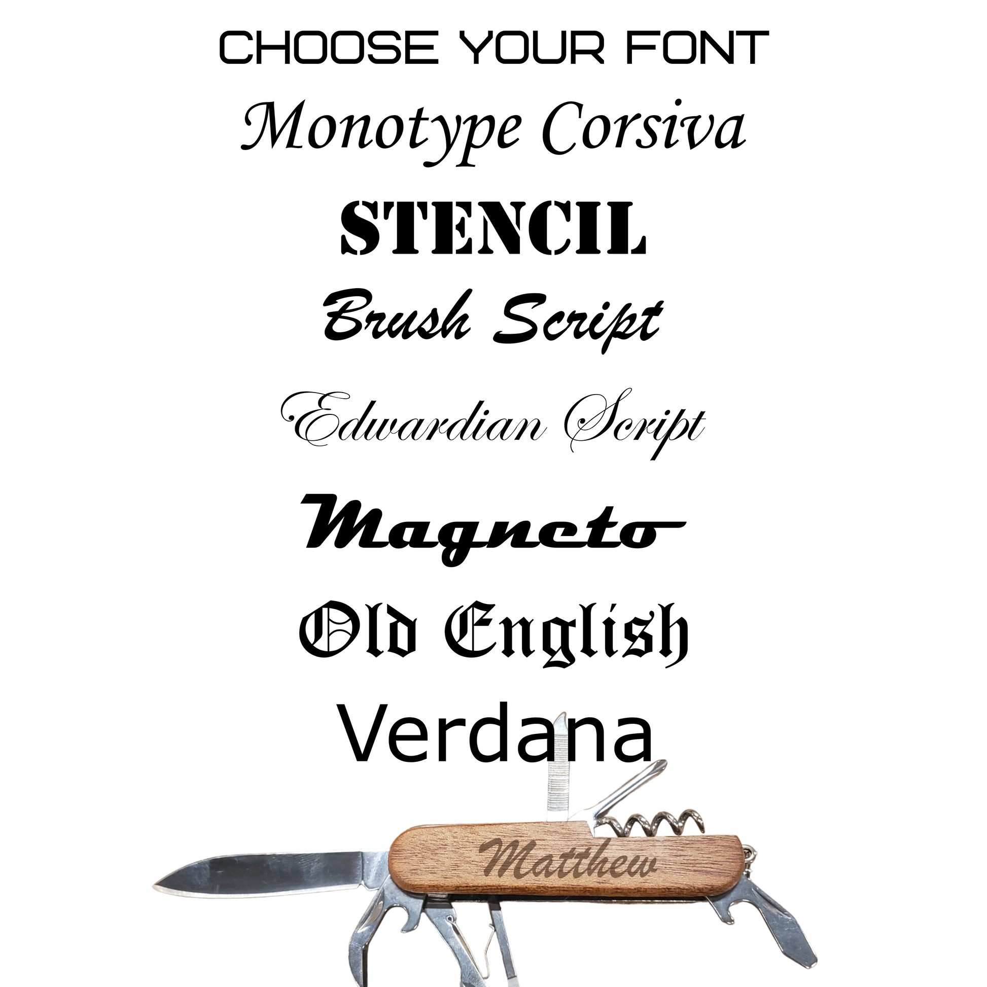 Add your name in your choice of 7 fonts! Name will be engraved on one side of the pocket knife.
