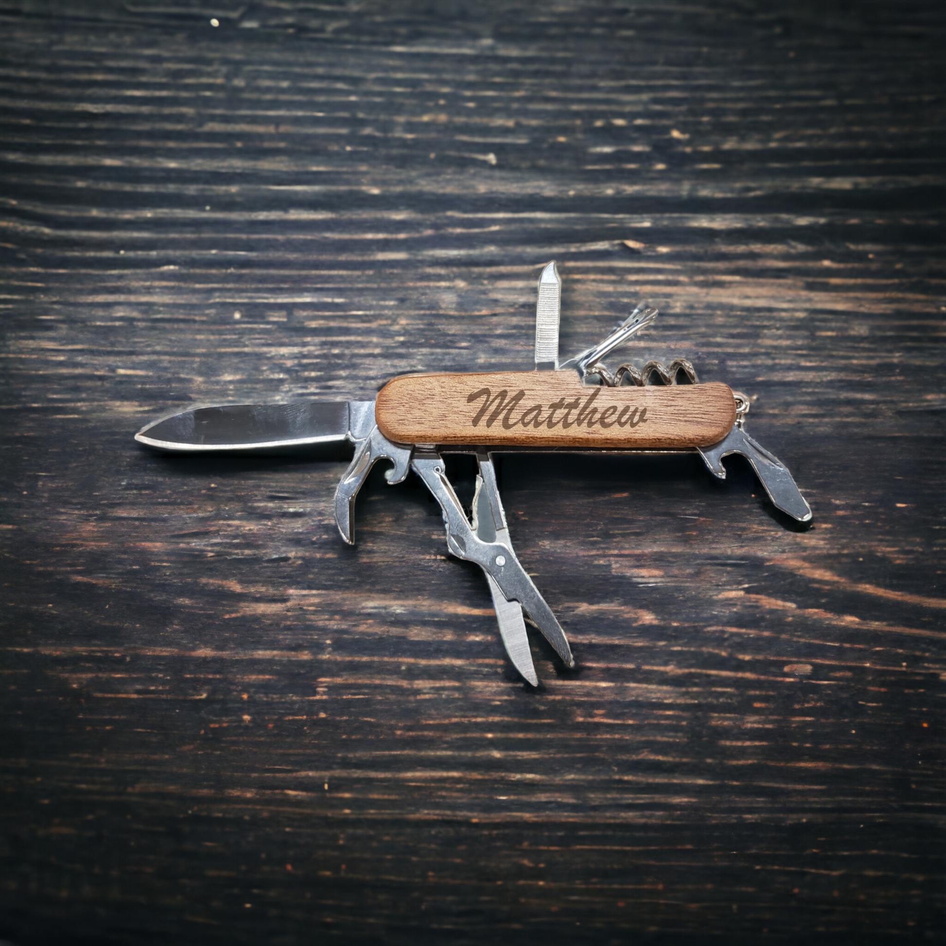 Personalized 3 1/2" Wooden 8-Function Multi-Tool Pocket Knife